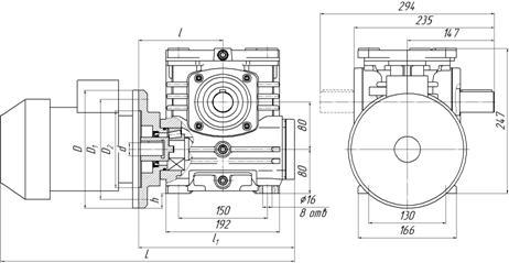 • двигатель горизонтальный, тихоходный вал вертикальный, слева от двигателя;